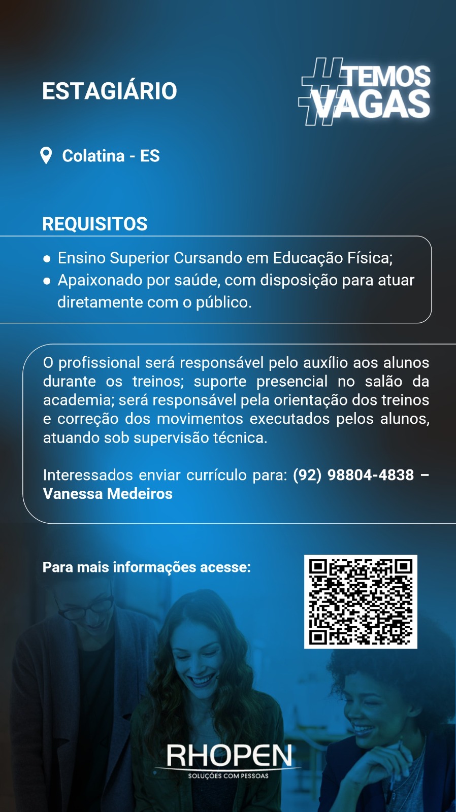 Os currículos poderão ser enviados para o e-mail Valdireni.rossi@es.sesc.com.br , aline.couto@es.sesc.com.br ou entregue na Unidade de Colatina. Poderão participar do processo Seletivo candidatos a partir do 3º período.