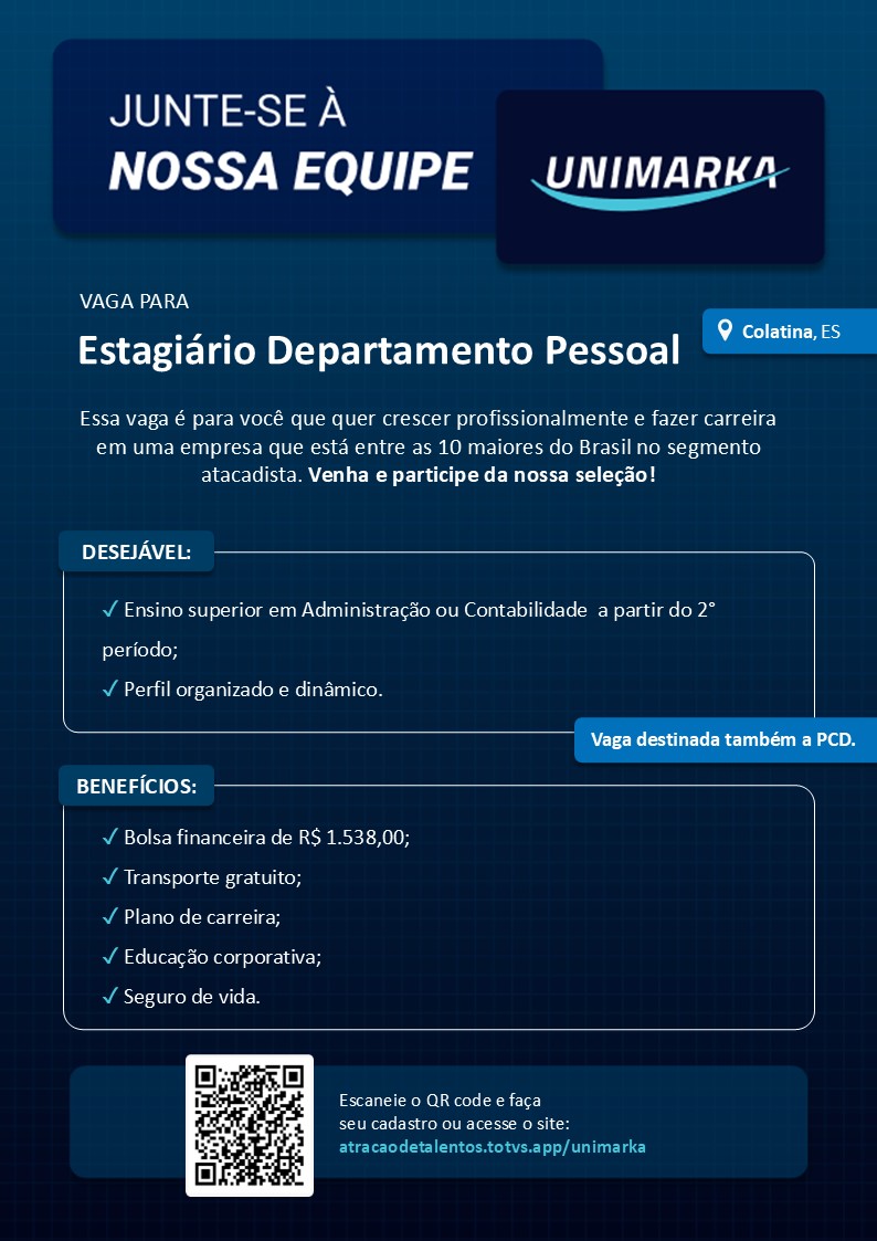 Estamos com (01) uma vaga de estágio para nível superior o curso de Administração.