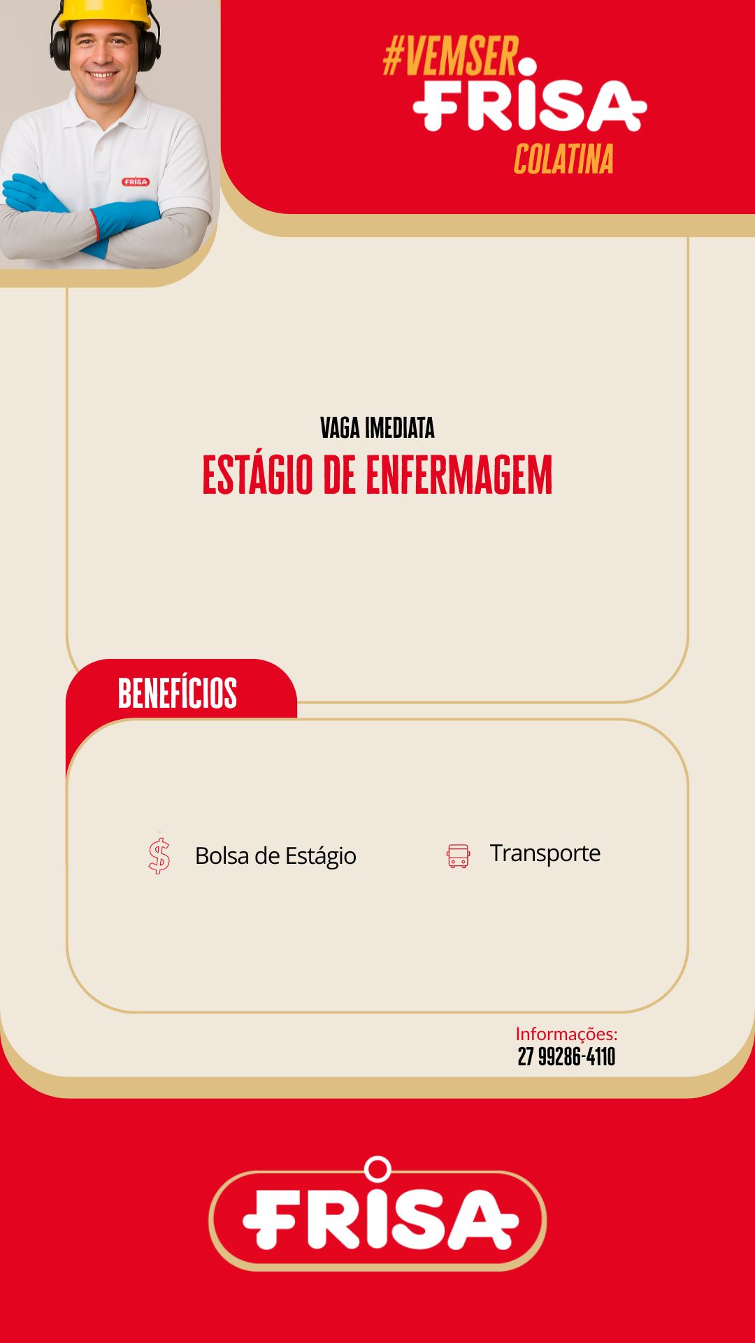 Vaga de estágio para os cursos de Enfermagem e Técnico em Enfermagem - FRISA Colatina.