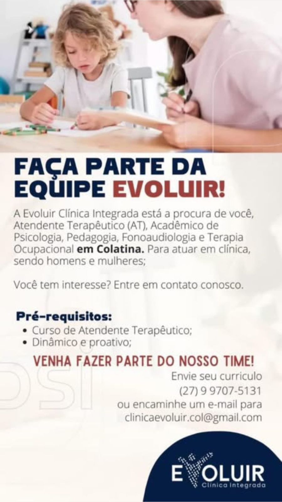 Vaga para Atendente Terapêutico na Evoluir Clínica Integrada, em Colatina/ES.  Pré requitisots: - Ter o curso de Atendente Terapêutico. - Ter atitude dinâmica e produtica.  - Cursando Ensino Superior em Pedagogia, Psicolgoia, Fonoaudiologia, Terapia Ocupacional. | Evoluir Clínica Integrada Colatina | Fonoaudiologia, Pedagogia, Psicologia e Terapia Ocupacional | Baixar anexo |