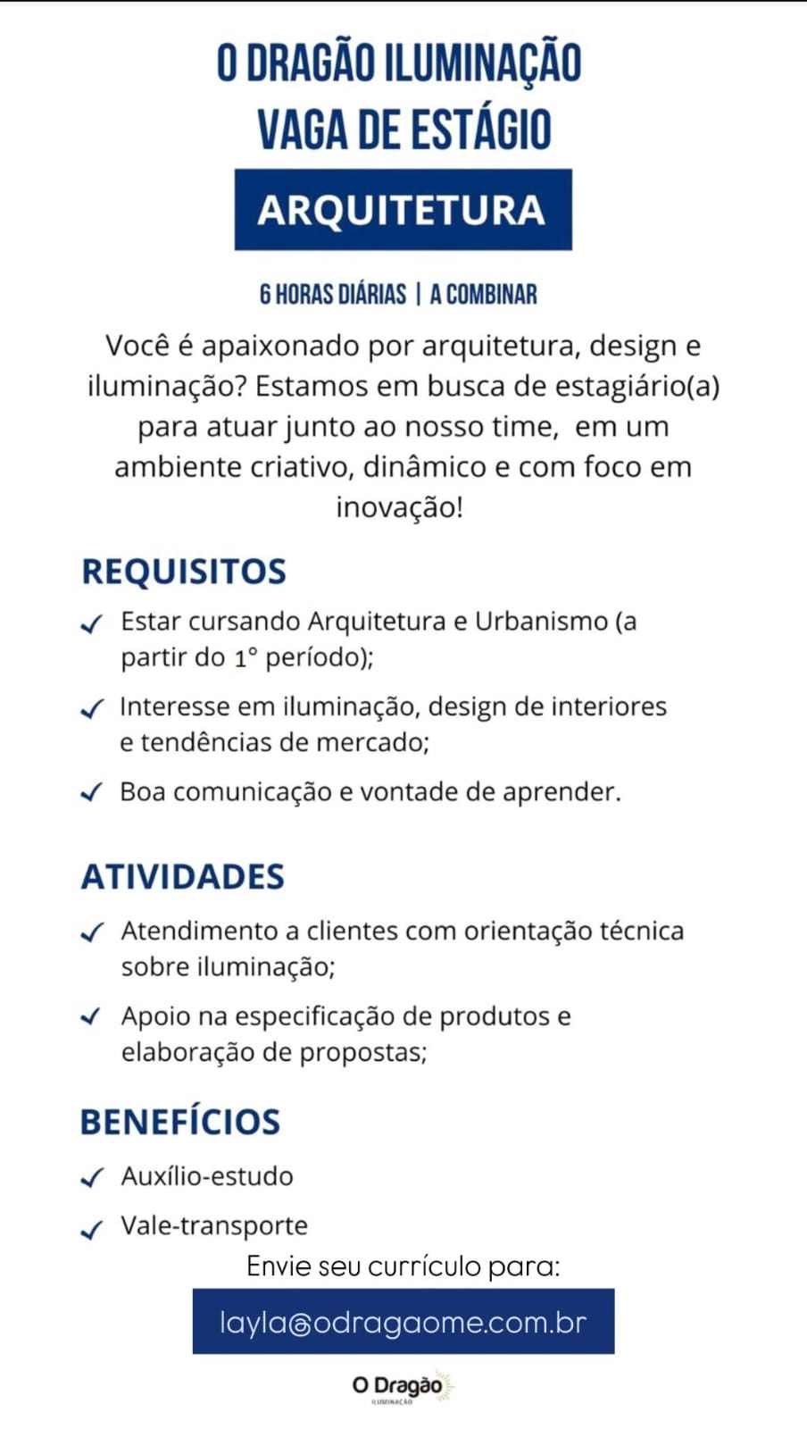 Cursando do 1º ao 8º semestre   Interessados devem acessar o link: https://portal.ciee.org.br/quero-uma-vaga   | O DRAGÃO ILUMINAÇÃO | Arquitetura e Urbanismo | Baixar anexo |